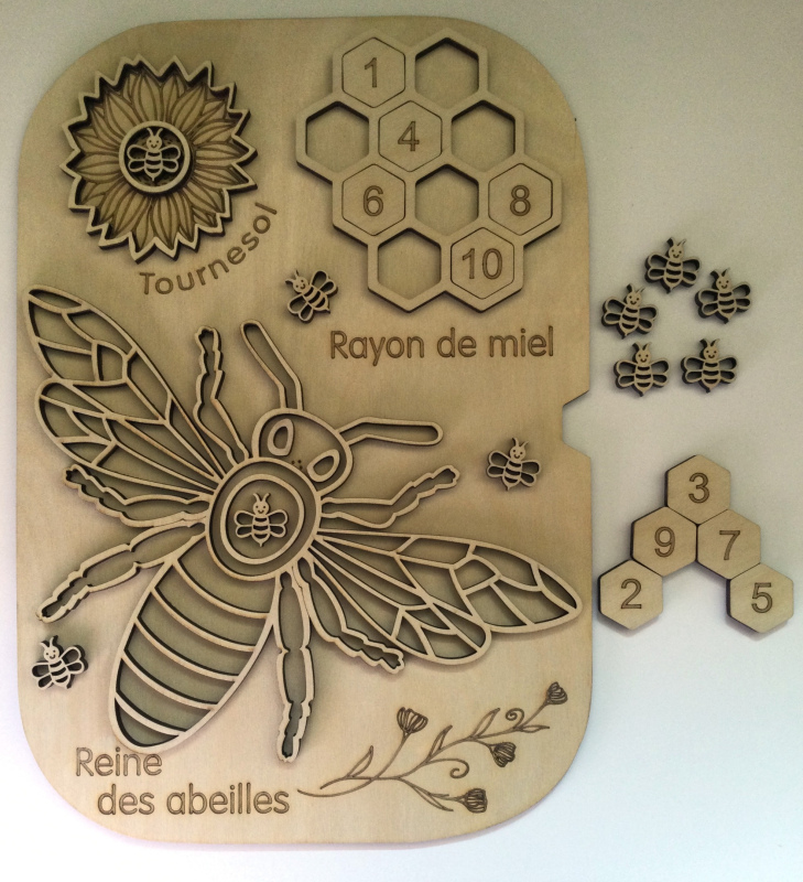 This Bee board has sections for sensory play (fill rice, pasta, beans, or peas), a honeycomb ten frame with 10 wooden bees.
